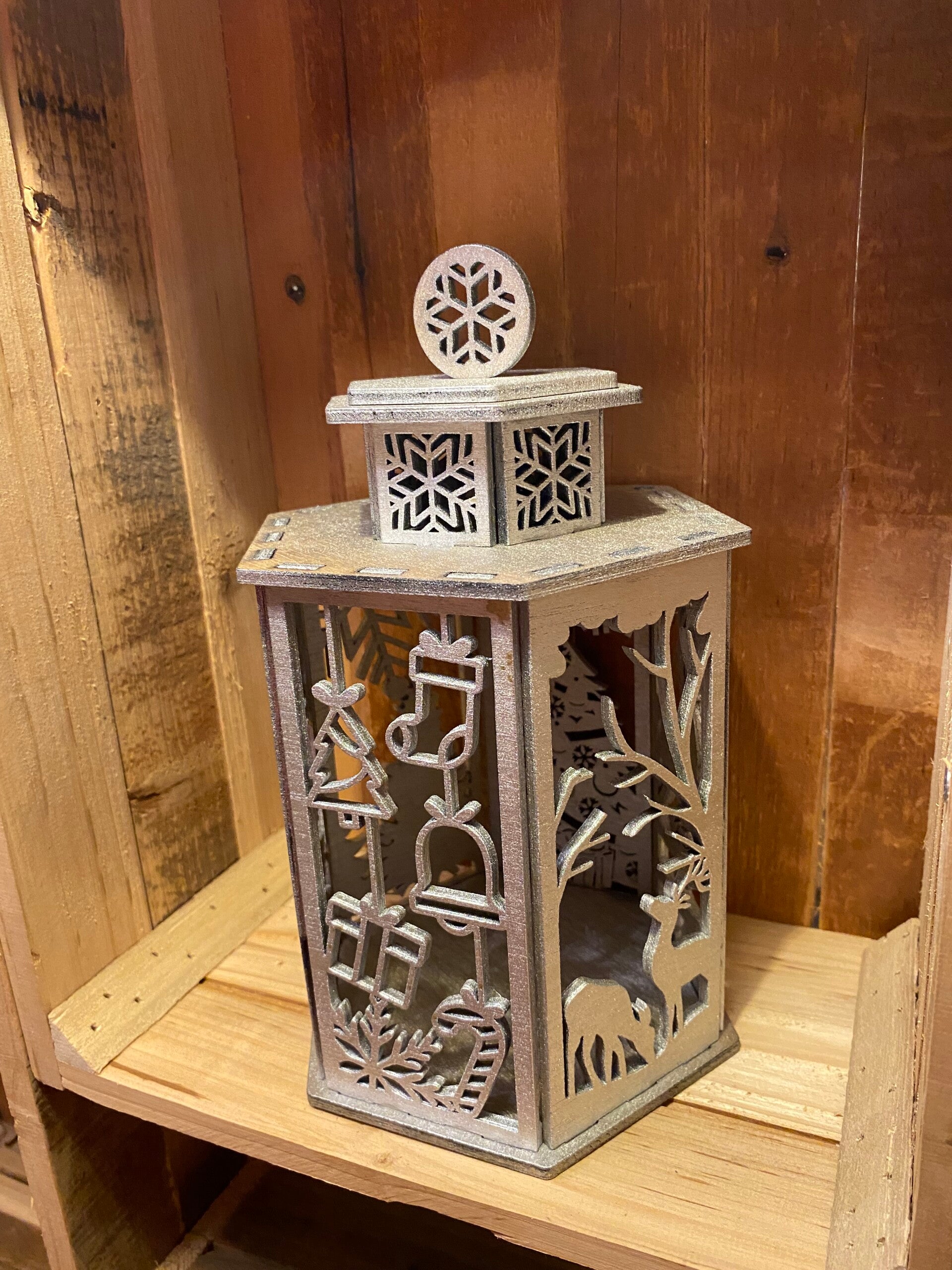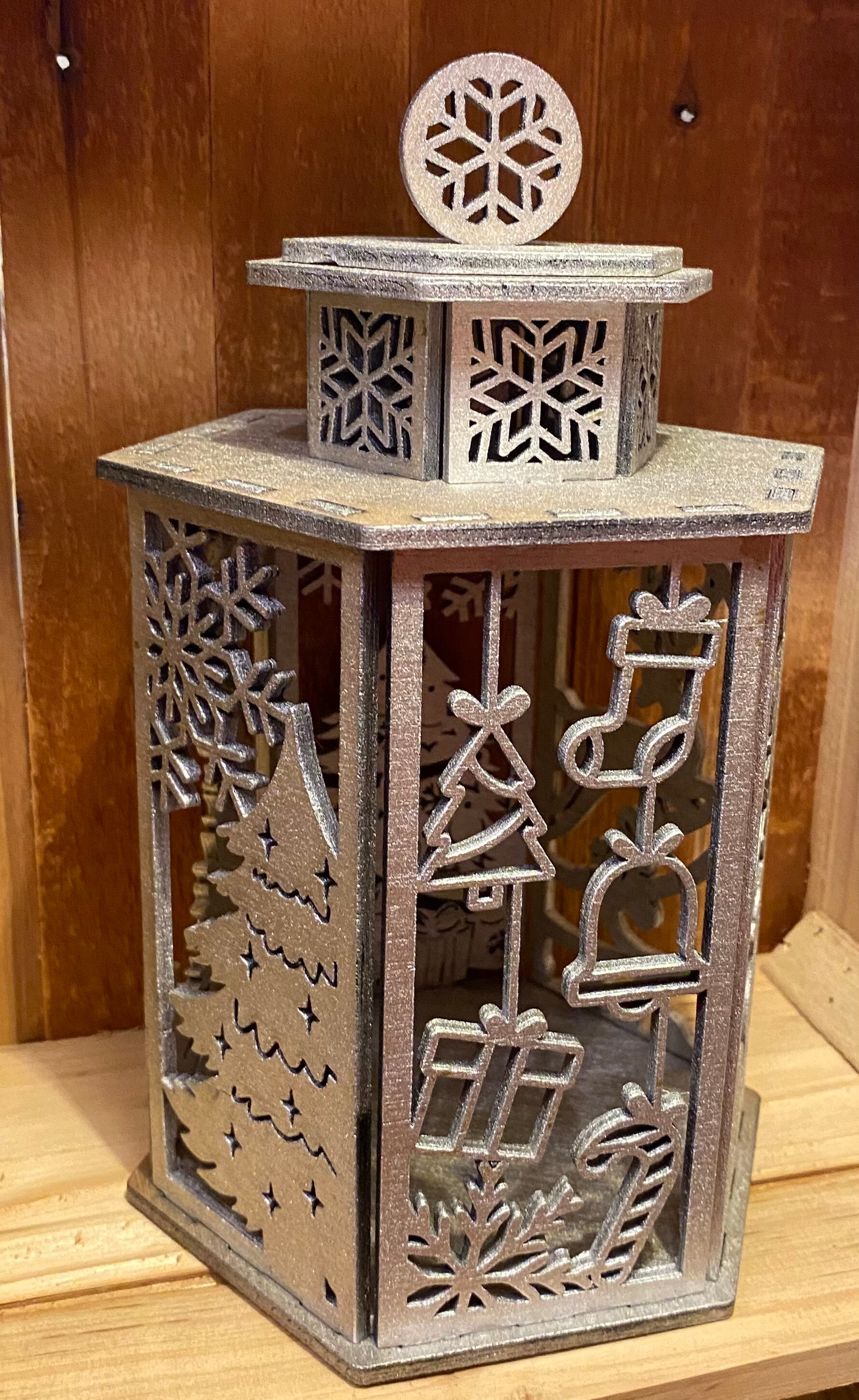 Breng sfeer in huis met deze rustieke zilverkleurige lantaarn vol fijne kerstdetails: sneeuwvlokken, cadeautjes en een sierlijke kerstboom. Perfect als tafeldecoratie of vensterstuk. Geschikt voor LED-verlichting.
