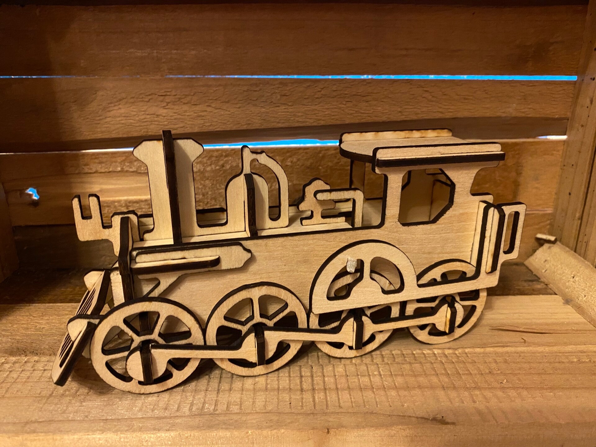 Een prachtig afgewerkt houten model van een klassieke stoomlocomotief. Met oog voor detail vervaardigd uit laser-gesneden hout, ideaal als decoratief stuk voor liefhebbers van treinen en nostalgisch design.