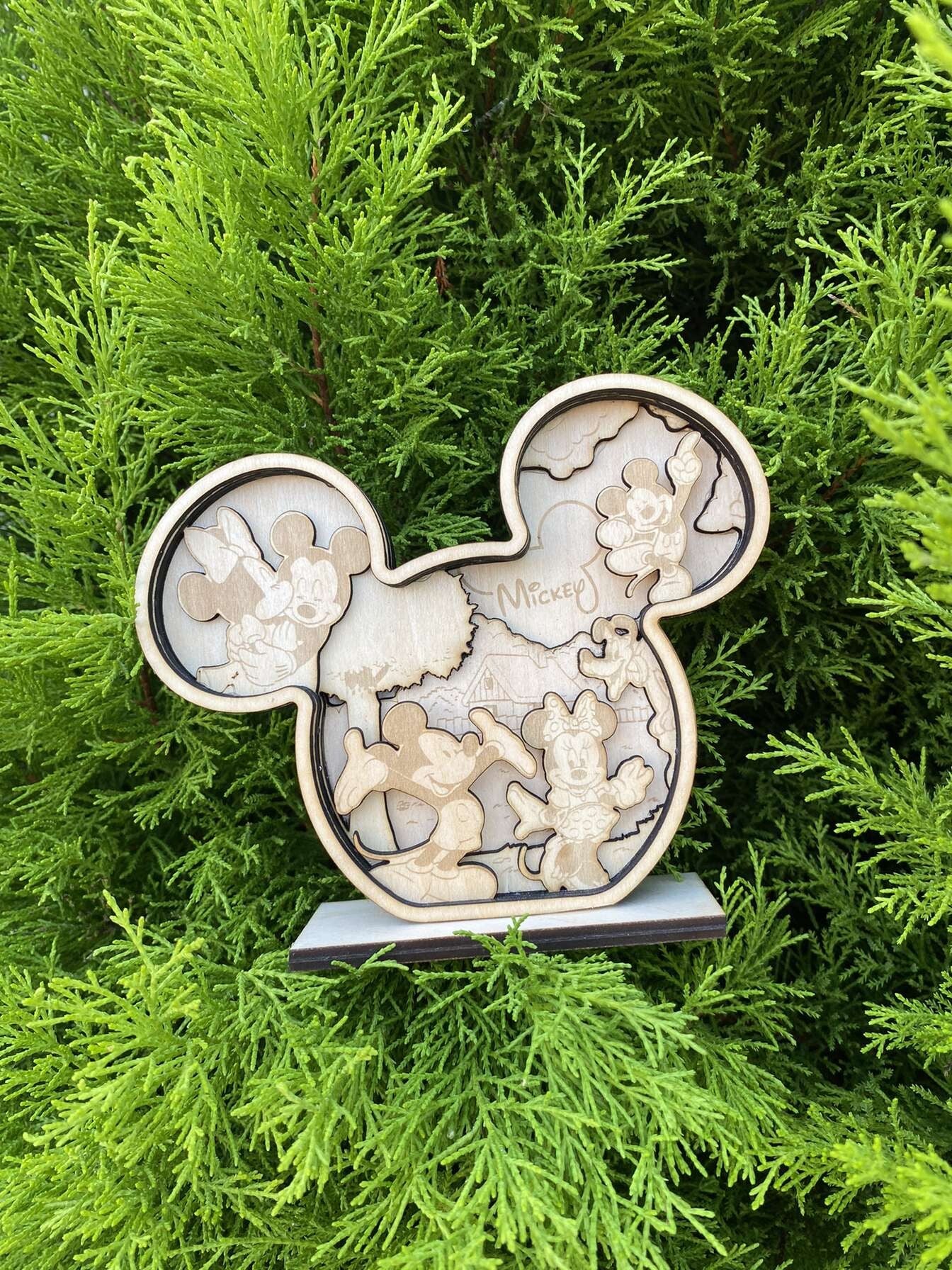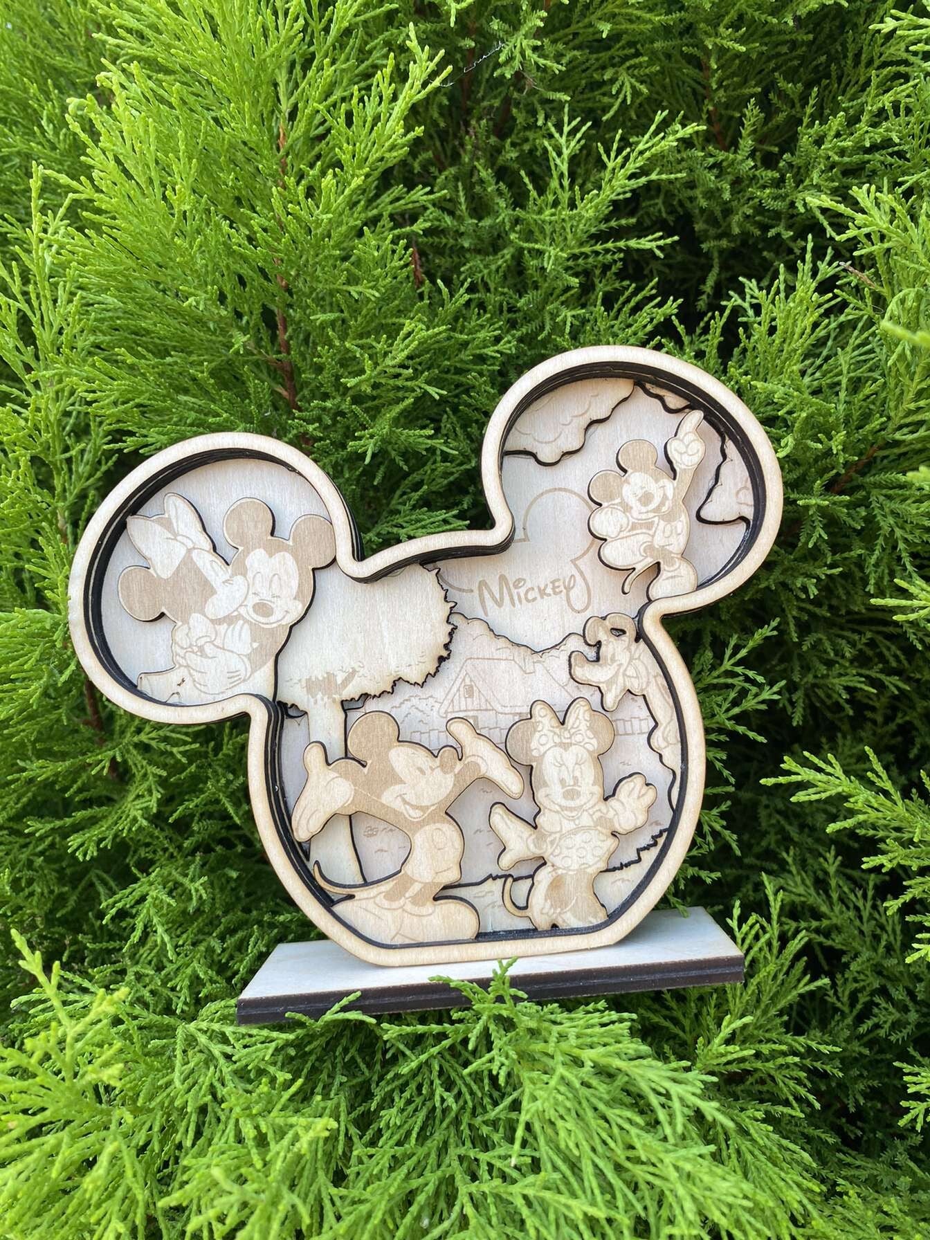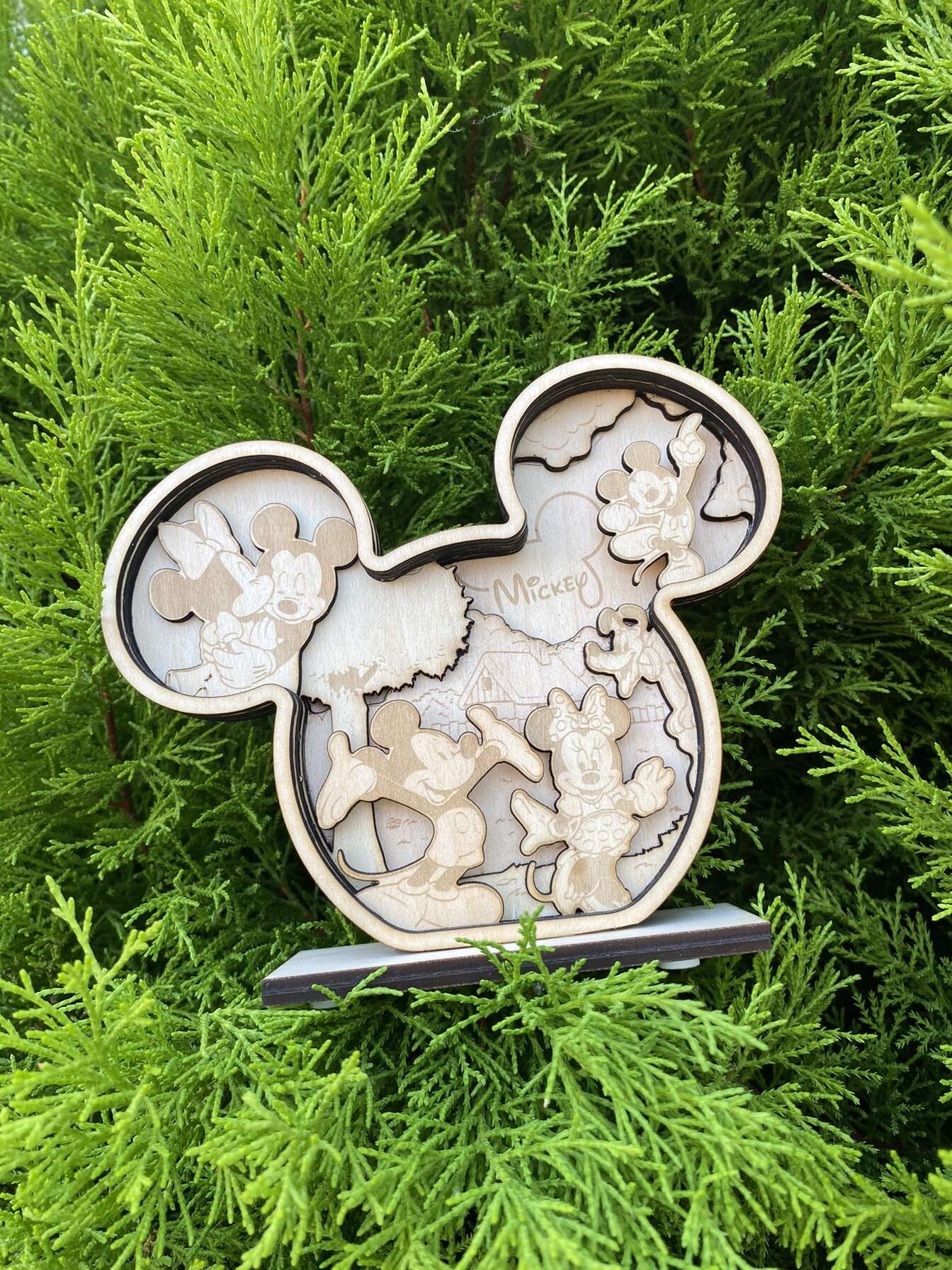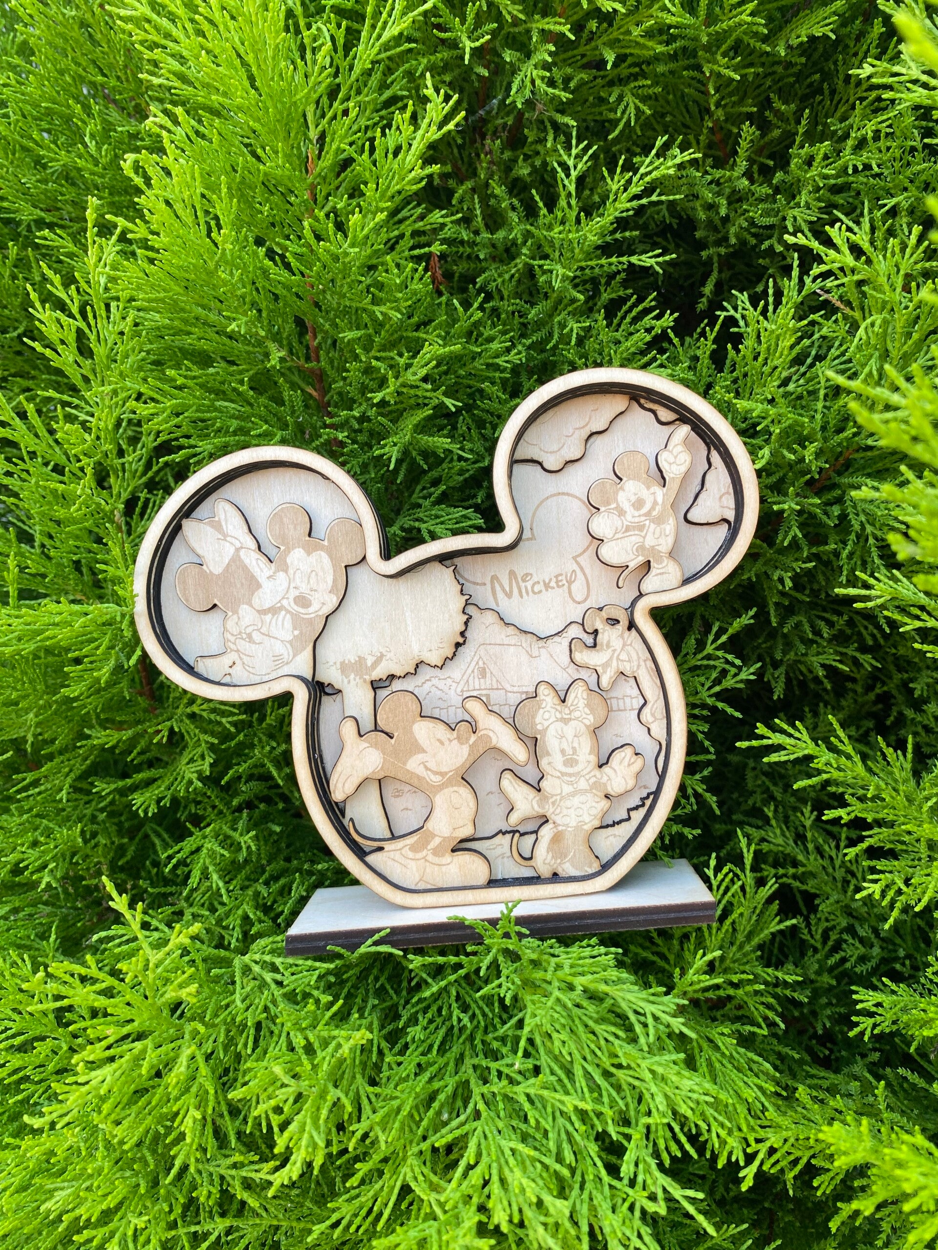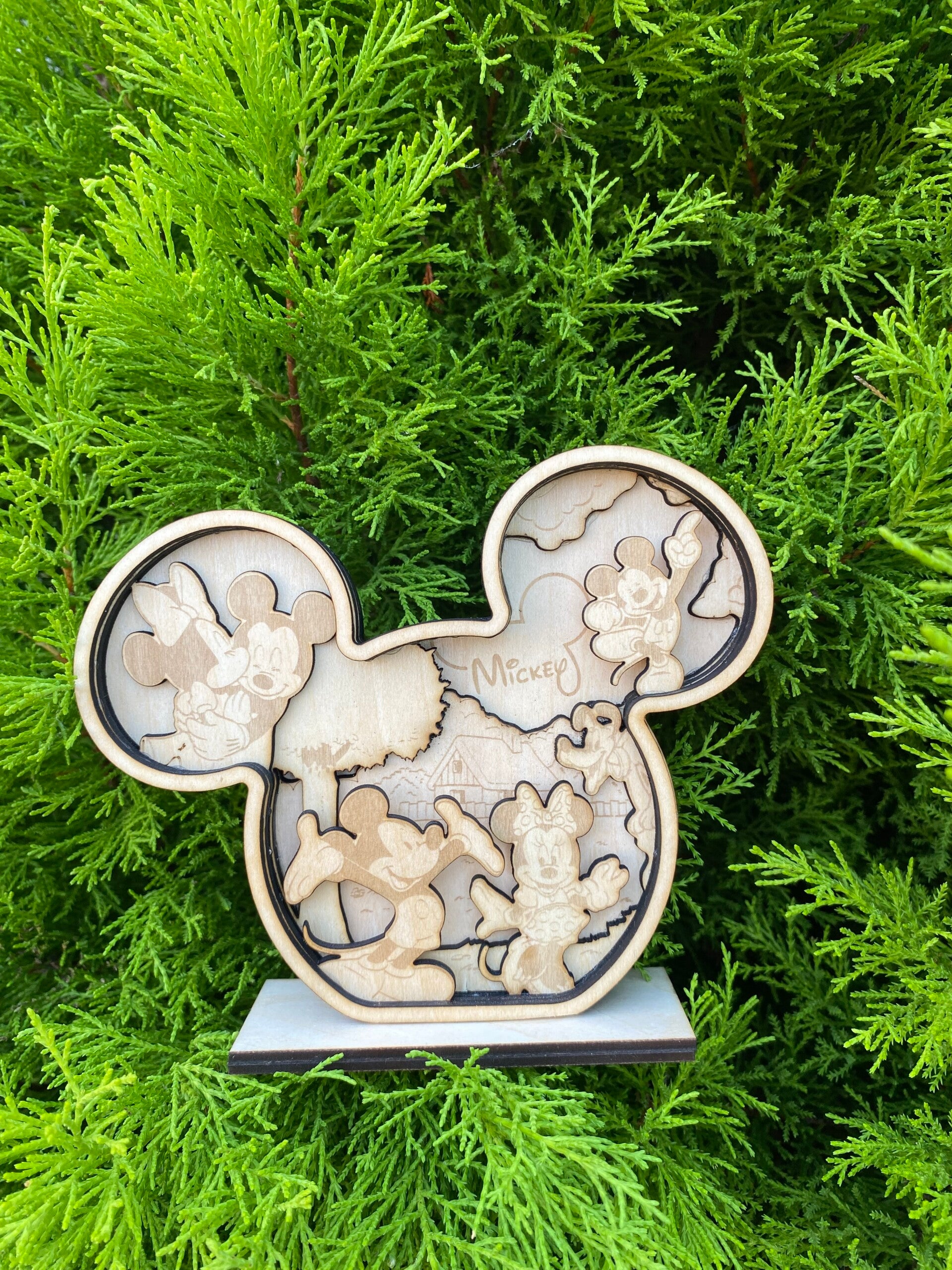 Laat je betoveren door dit unieke houten kunstwerk in de iconische vorm van Mickey Mouse. Met zes uitgesneden lagen, elk rijkelijk gegraveerd met geliefde Disney-personages zoals Mickey, Minnie en Goofy, is dit stuk een waar eerbetoon aan Disney-magie. De combinatie van diepte, detail en ambacht maakt het een opvallend decoratief object voor elke fan of verzamelaar. Perfect om te presenteren in een vitrine, op een plank of als eyecatcher in je interieur.